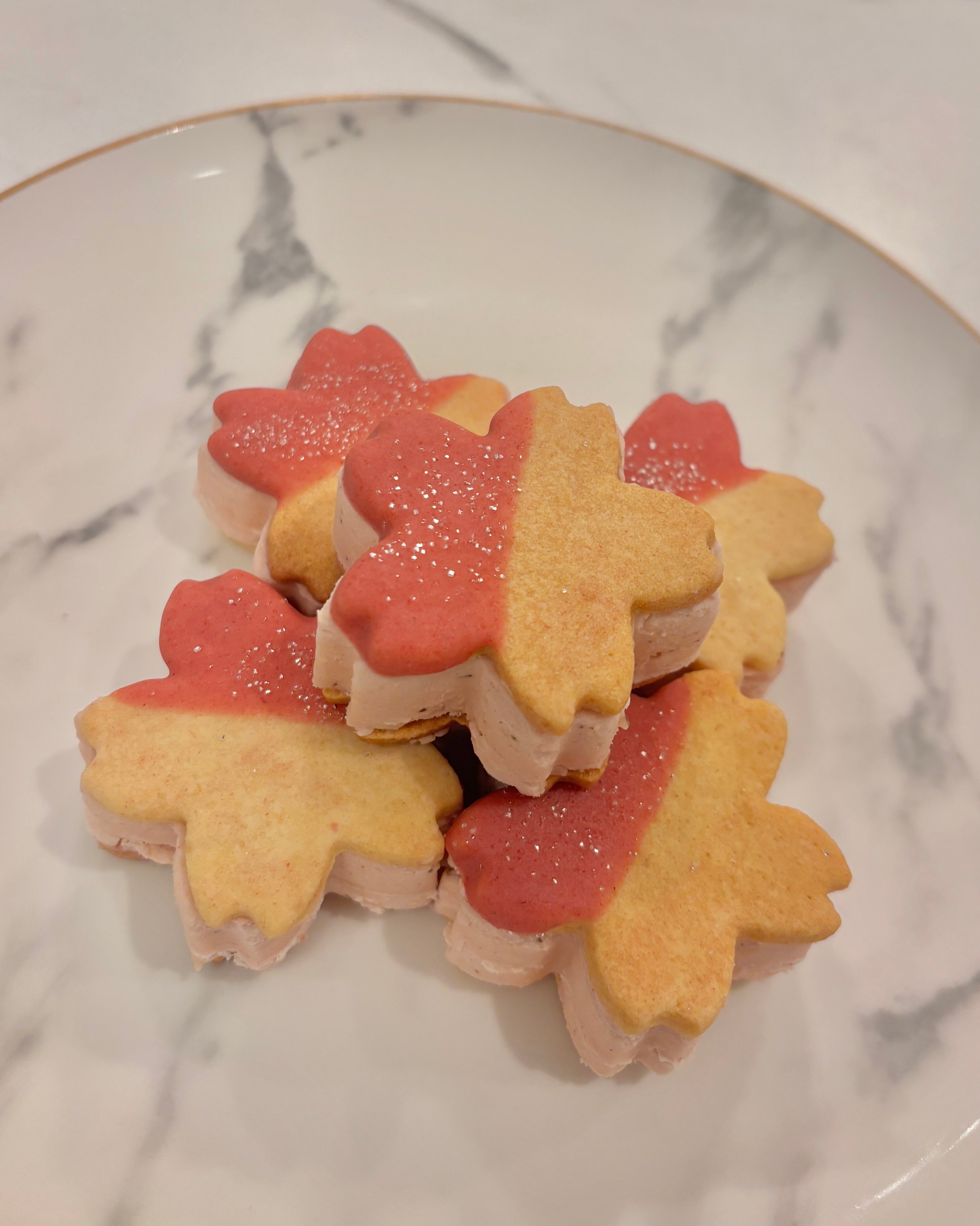 バターとホワイトチョコレート、いちごチョコレートの軽いバタークリームに桜あんを合わせ、桜味のクッキーでサンドした季節限定のお菓子です♩
