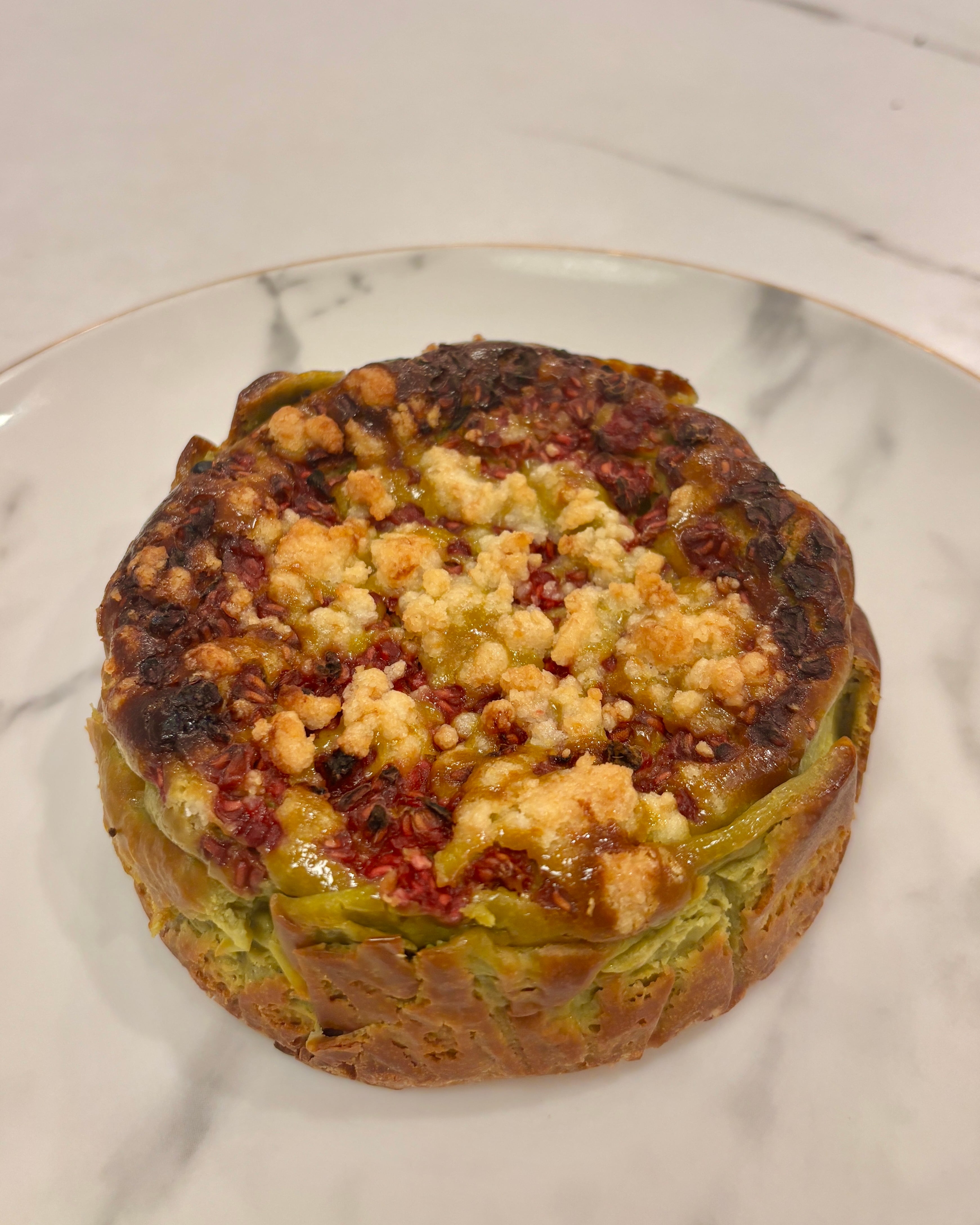 ピスタチオペーストを練り込み、ラズベリー、米粉のクランブルを乗せてじっくり焼き上げたケーキです♩